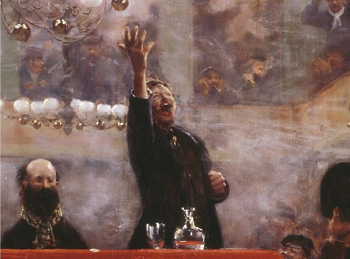 Публика в восторге от оратора, который и говорит с жаром, и жестикулирует так, что вот-вот его рука улетит куда-нибудь в зал. О чем он говорит? Скорее всего, о том, что в жизни нет справедливости, что нет свободы, равенства, братства, что это никто не принесет на блюдечке с голубой каемочкой, что надо это добывать своими руками (надо понимать, не его руками, а руками слушателей).