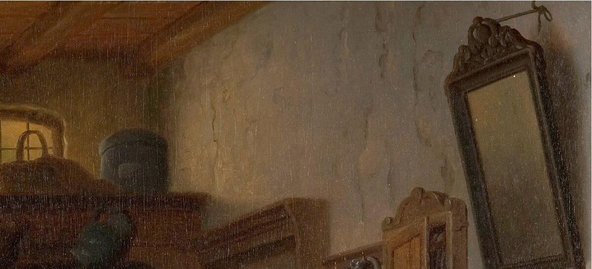 Сломанная трубка и опрокинутый табурет наводят на мысль, что этой сцене предшествовала какая-то борьба: может быть, старый ловелас хотел обнять девушку, она его слегка оттолкнула, он уронил трубку и приземлился на стул, а она задела табуретку, и табуретка опрокинулась.