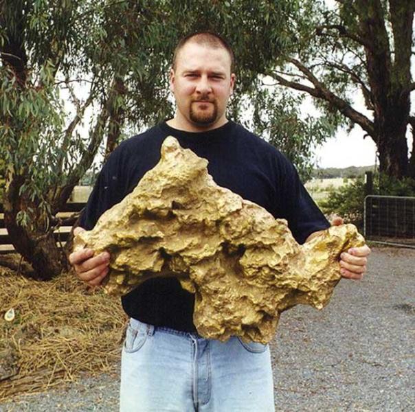 Был еще один самородок, найденный в Калифорнии в 1954 году, который тоже выставлялся на выставках. Один старатель копал могилу, чтобы похоронить умершего напарника. И нашел кусок золота весом 36 кг. Он стал выставлять его на выставках — за плату. И заработал на этом $ 10000. Но потом все же продал и сам самородок — за $ 22700.
