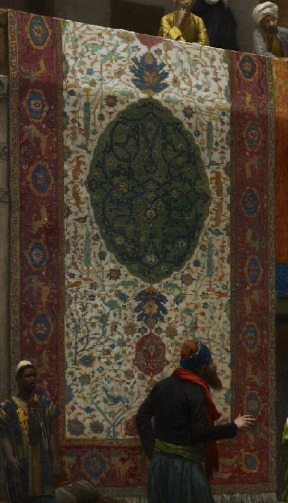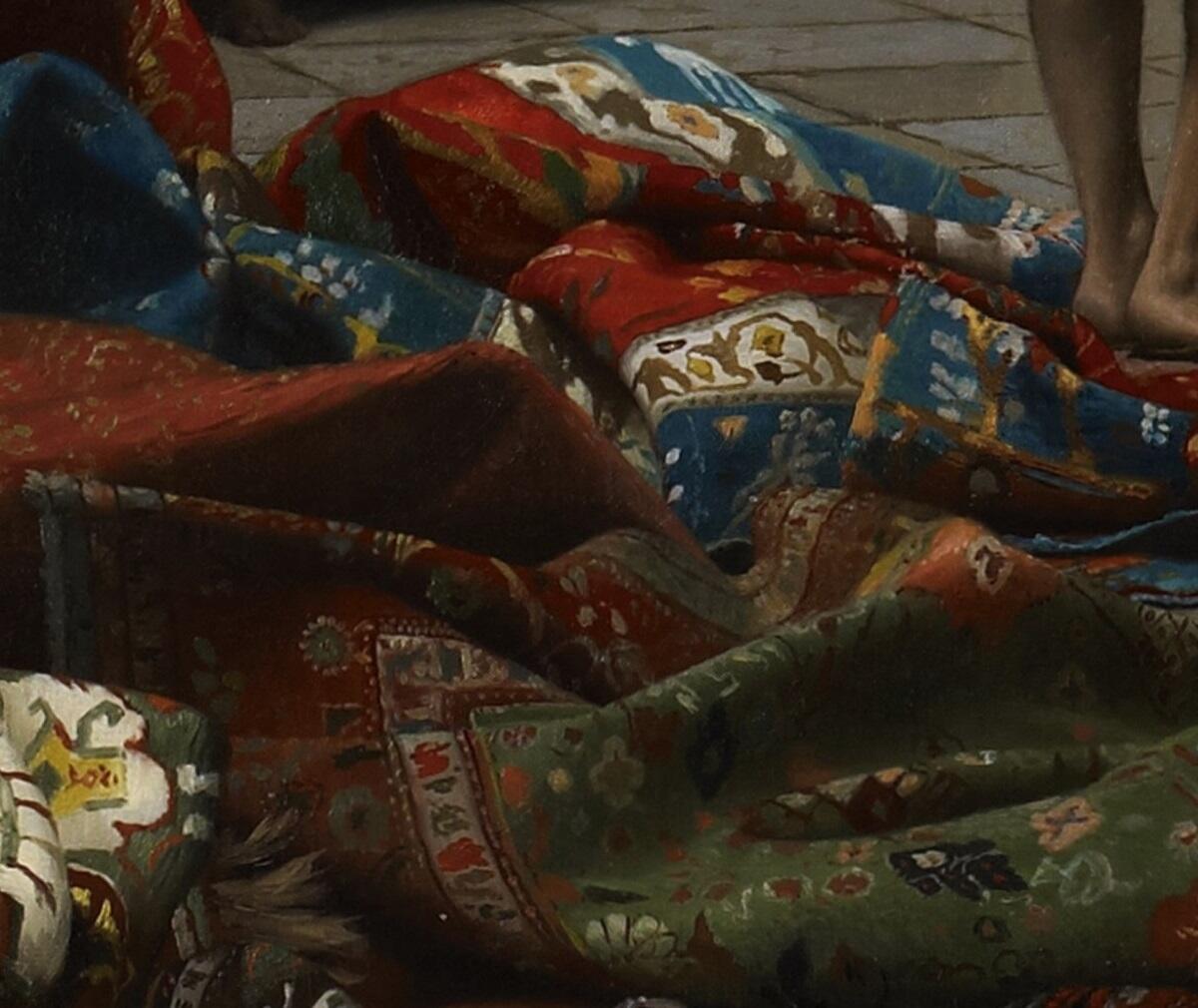 Ковер на картине Жан-Леон Жерома — поменьше размером, его узор крупнее, чем на ковре Ардебиль. Но ковер на картине Жан-Леон Жерома прекрасен! Глаз зрителя поражает скрупулезная работа художника, который донес до нас свое восхищение искусством египетских ковровщиков…