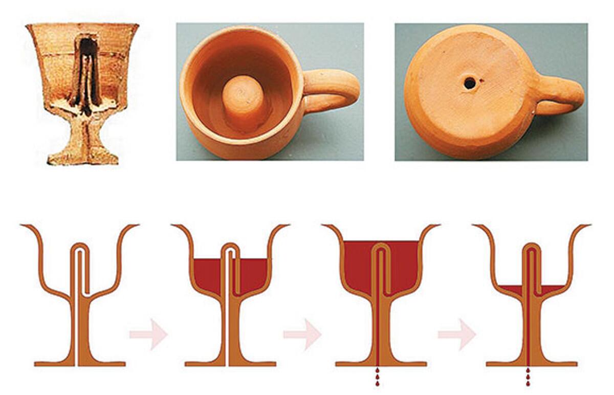 Чаша Пифагора — вроде бы обычный сосуд, из которого можно пить хоть воду, хоть вино. Но существенное отличие имеется. Посередине чашки высится какой-то странный стержень, а в дне имеется отверстие. Если наливать в чашку немного жидкости, эту жидкость можно будет выпить без всяких проблем. Проблемы начнутся, если пожадничать и наполнить чашку выше определенного уровня, который обычно отмечен на стенке чертой. Тогда жидкость начнет течь из донного отверстия, причем до тех пор, пока весь сосуд не опорожнится. Тот, кто желает получить больше других, не получает ничего. Весьма наглядный урок правильного поведения!