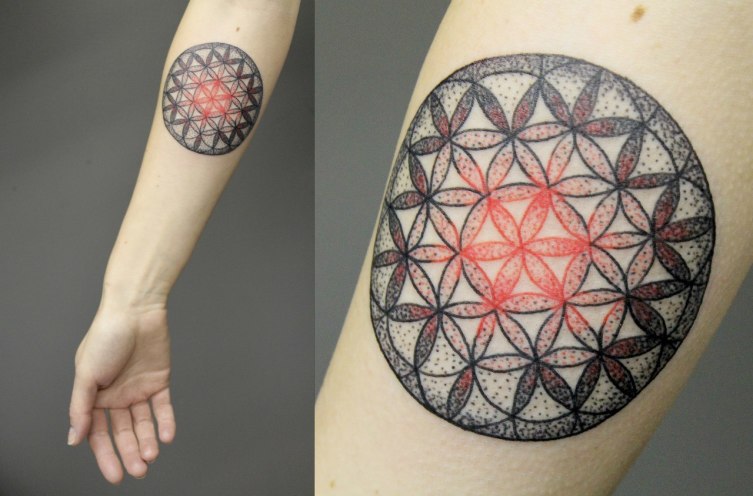 Мандала «Цветок жизни» состоит из сферы, круга, в который вписаны девятнадцать равных, пересекающихся кругов. Смысловой центр её изображения — сфера (объединяющая и включающая в себя круги), и центральная точка — соприкосновение кругов. Последняя символизирует центр мироздания, основу существования.