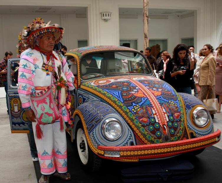 Одна из работ этих мастеров (точнее двух уичольских семей) даже была приобретена Королевским музеем изящных искусств Брюсселя. Это старый автомобиль Volkswagen Beetle, декорированный вручную снаружи и внутри двумя миллионами (!) бисеринок (более 90 кг). Чтобы привлечь внимание к Мексиканской культуре в целом и к мастерству уичольских индейцев в частности, эта машина колесила по миру, останавливаясь в известнейших музеях.