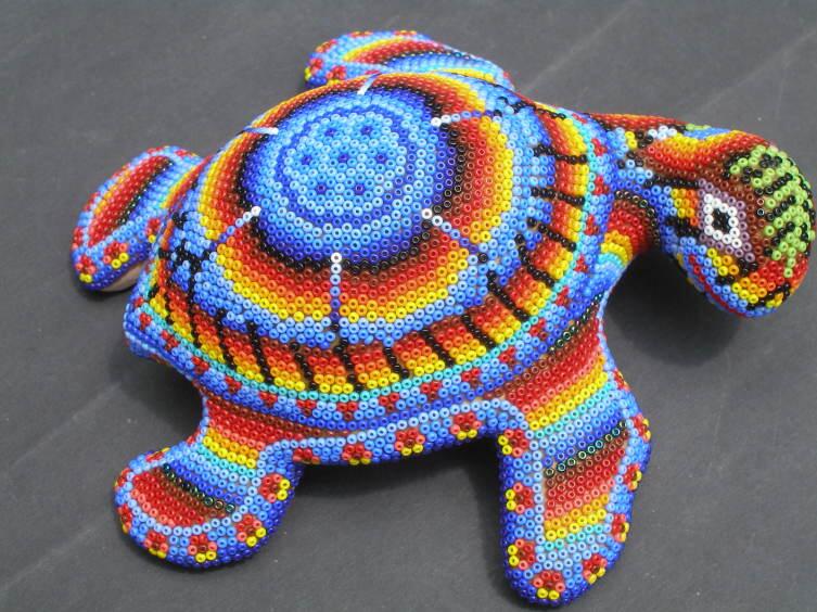 Одна из техник, используемых мастерами племени Уичоль (наиболее красочная, яркая и запоминающаяся) — инкрустация бисером. Этой бисерной мозаикой они украшают различные фигурки животных, предметы быта. Это ремесло сродни аппликации: маленькие бисеринки одна за другой приклеиваются к заготовке из дерева. Вместо клея зачастую они используют пчелиный воск. Работа эта кропотливая, но результат просто потрясает.