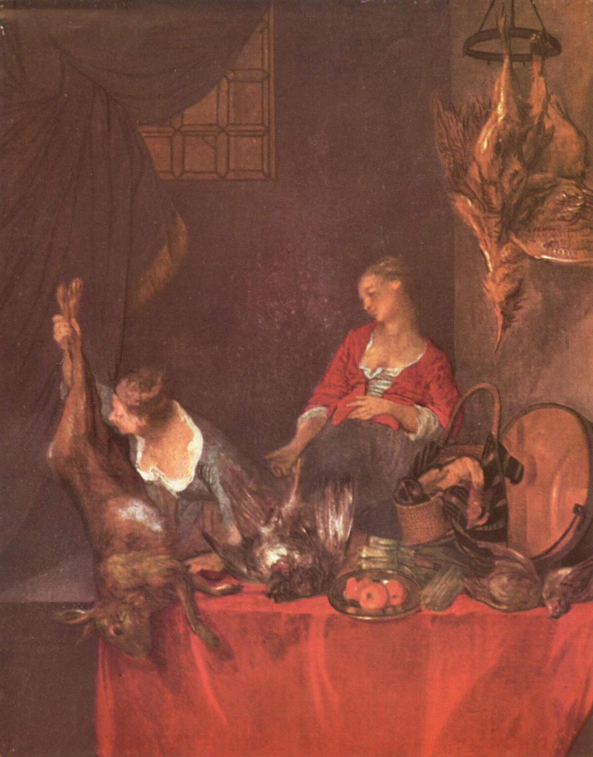 На столе в живописном беспорядке разнородные предметы: справа большая блестящая начищенной медью кастрюля с дужкой, близко к краю — тарелка с яблоками, за ней — связка лука-порея, битая дичь — в центре стола, справа, сверху на подвеске. И самый крупный зверь — слева, его длина от кончика носа до пяток почти равна человеческому росту (зверь очень похож на кролика). Кухарка подняла его за ноги и не то что-то рассматривает, не то нюхает.