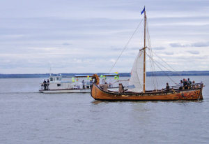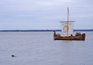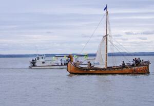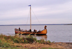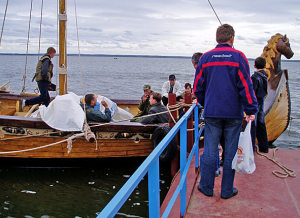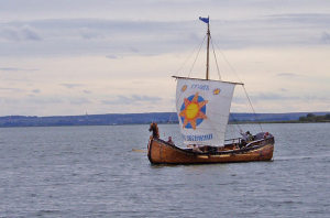 Спустили на воду. Унесло корабль ветром куда-то к противоположному берегу. Экипаж долго выгребал против ветра. Вокруг суденышка кружили моторки — предлагали дотащить до города, но мужики, чувствовавшие себя уже идейными потомками викингов, гордо отказались…