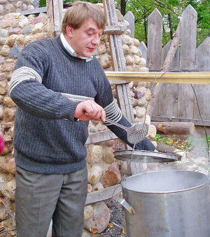 Я успела рассмотреть лишь заключительный этап варки супа — когда кулинар вливал в огромный котел с красно-коричневым варевом четыре больших пластиковых бутылки пива. Мигом до краев поднялась волна разноцветной пены — и опала после размешивания. Затем суп разлили по кружкам и раздали всем с предупреждением: «Очень горячо!».