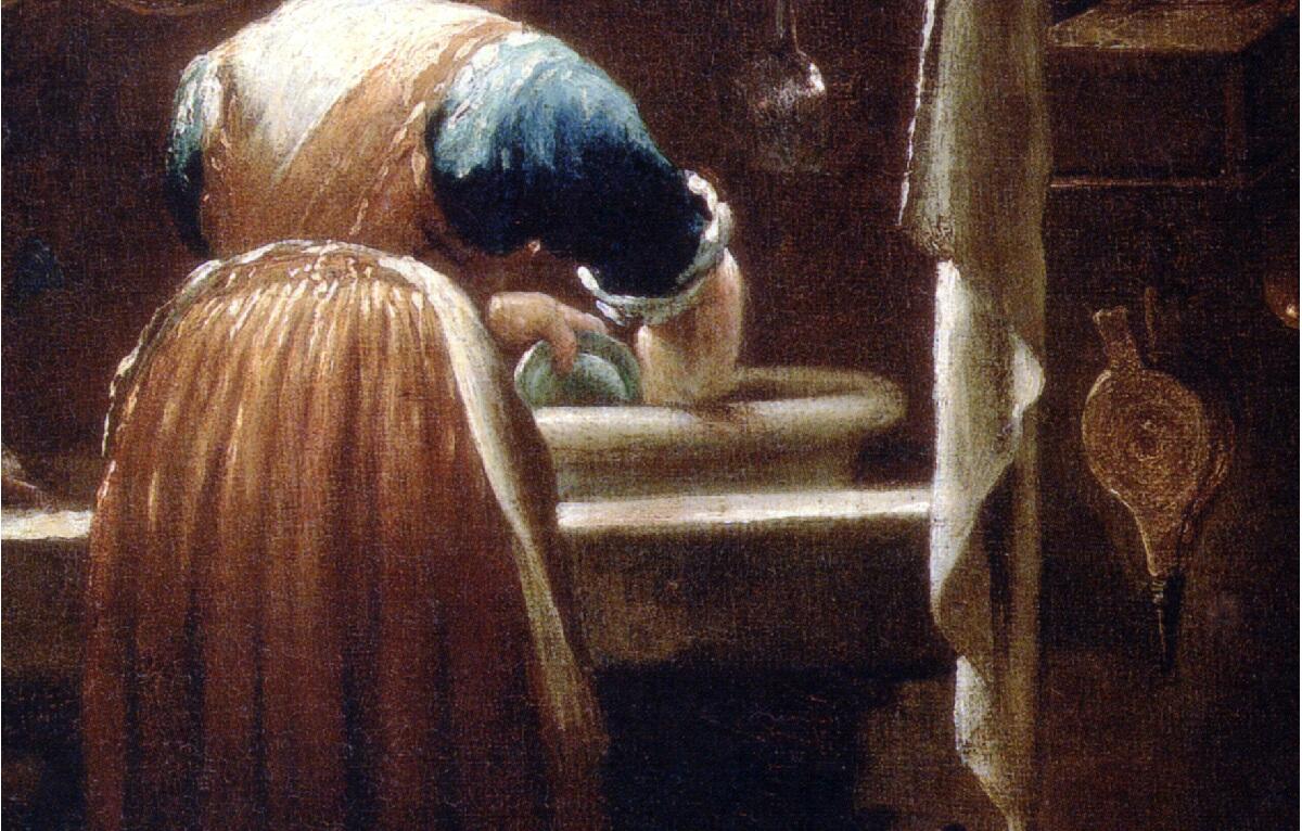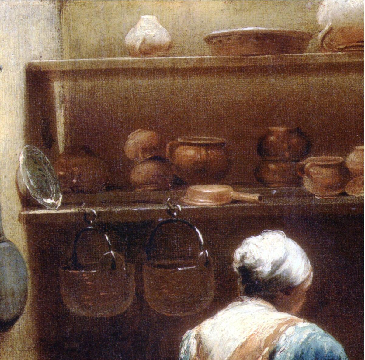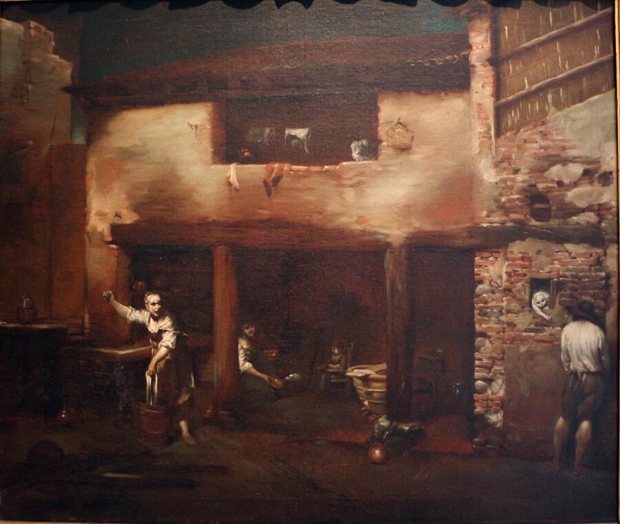 Прежде всего, это кухня простолюдина — и по объему пространства, и по инвентарю. Места едва хватает, чтобы кухарка весьма скромных размеров могла в ней поместиться. Она стоит возле раковины и моет посуду. Здесь стоит вспомнить, что картина датирована 1712 годом. Поражает организация процесса мойки да и собственно кухни.