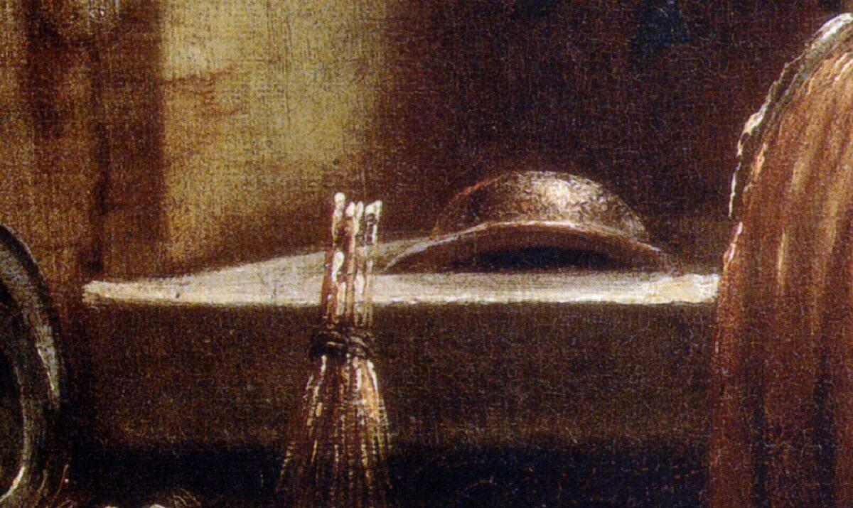 В руке у кухарки — нечто вроде губки. Правее просматривается подвешенный на стенке маленький мех для разжигания камина (сам камин, надо полагать, еще правее, у обреза картины).