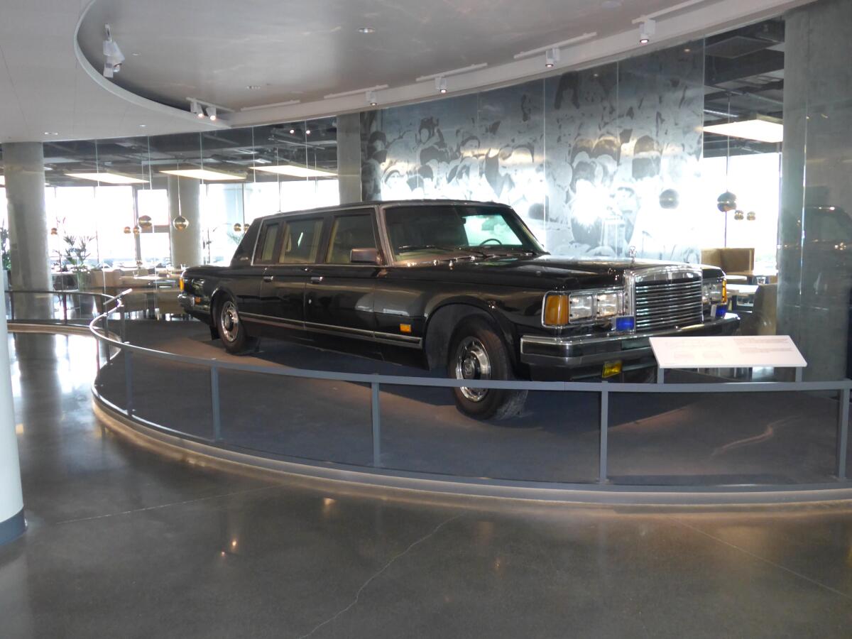 Сразу при входе, на первом уровне, можно видеть стенды с подарками президенту и бронированный лимузин ЗИЛ-41052, на котором