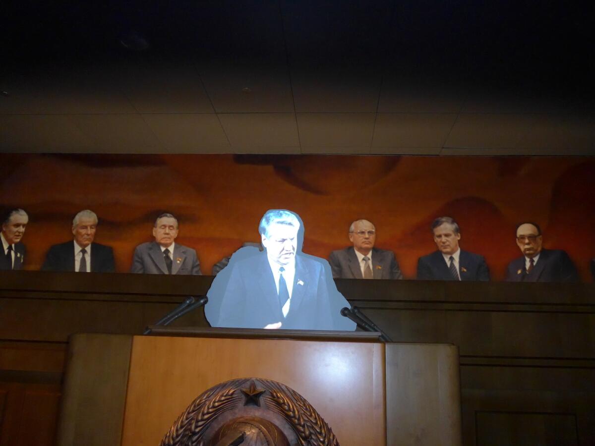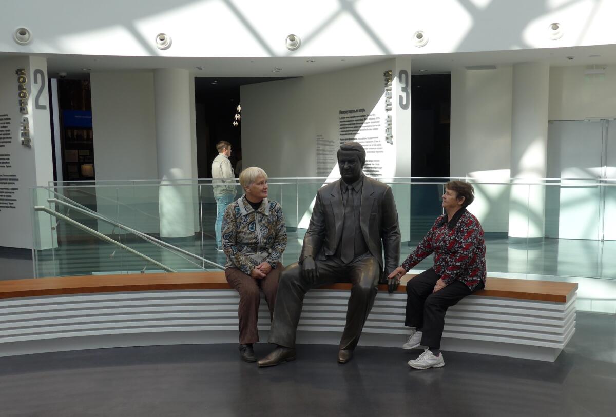 Затем поднимаемся на второй уровень, в огромный круглый зал, в центре которого площадь, на скамье «сидит» бронзовый Ельцин, а напротив него большой телеэкран. Можно присесть к президенту, сфотографироваться с ним и посмотреть фотографии из его архива.