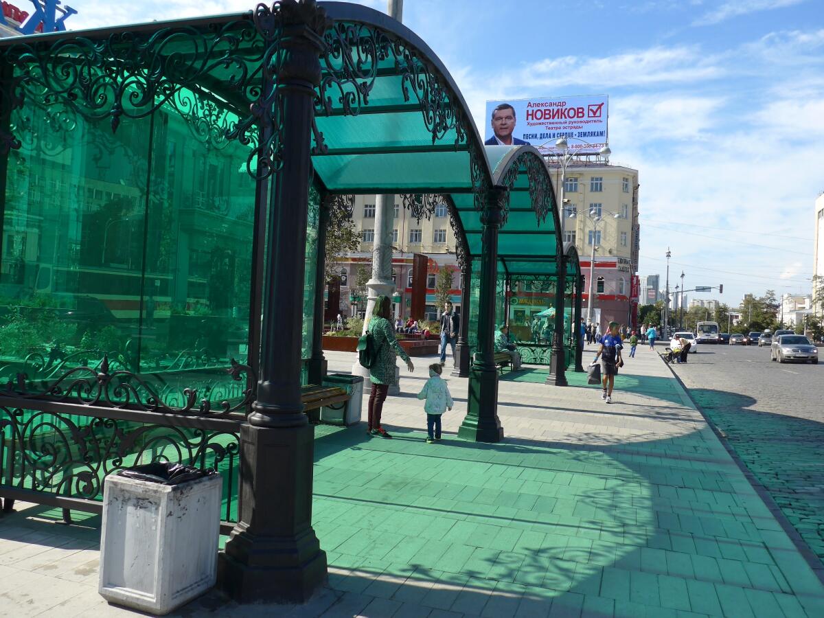 Марк Блау, здравствуйте! Я жила на улице Куйбышева, недалеко от Шарташского рынка, и там почти через дорогу жд станция Шарташ, откуда одни раз съездили на дачу к подруге. Всего я пробыла там неделю, примерно половину времени шли дожди и было довольно холодно.В целом город чистый, зеленый, центр вообще привлекателен. Вот фото улица с зонтиками, по моему это на ул Малышева, но может ошибаюсь, сразу не записала.И какие красивые есть остановки, ажурные, чугунные.