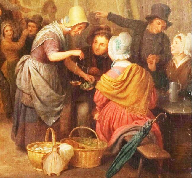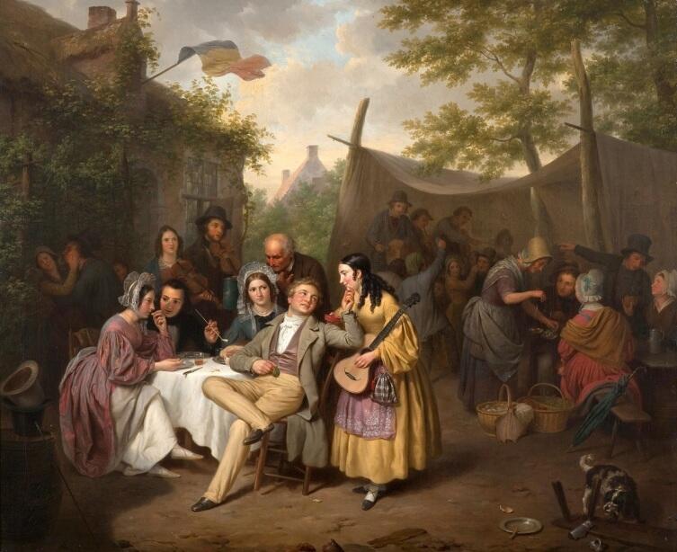 Сюжет картины изображен под сенью государственного флага Бельгии, вывешенного над трактиром, под этим флагом бельгийцы шли в бой за независимость (скорее всего, он уже не первый год видит такие гулянки: у него обтрепаны края, и с годами энтузиазм граждан слегка погас, на новый надо раскошелиться, а государство ничего не дает).
