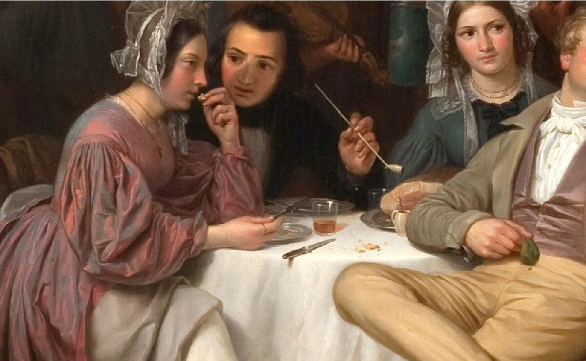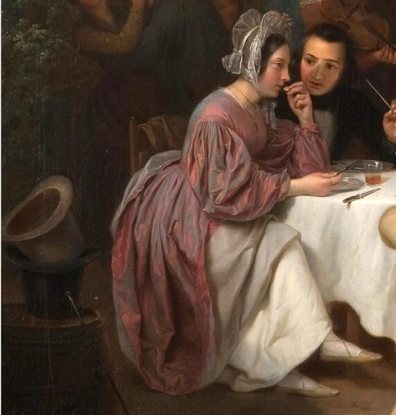 Что они здесь делают? Скорее всего, отправились прогуляться в окрестностях близлежащего городка, а сейчас расположились в ожидании трапезы (на столе нет выпивки, а из закуски — только окорок, столовые приборы и девственно чистые тарелки).