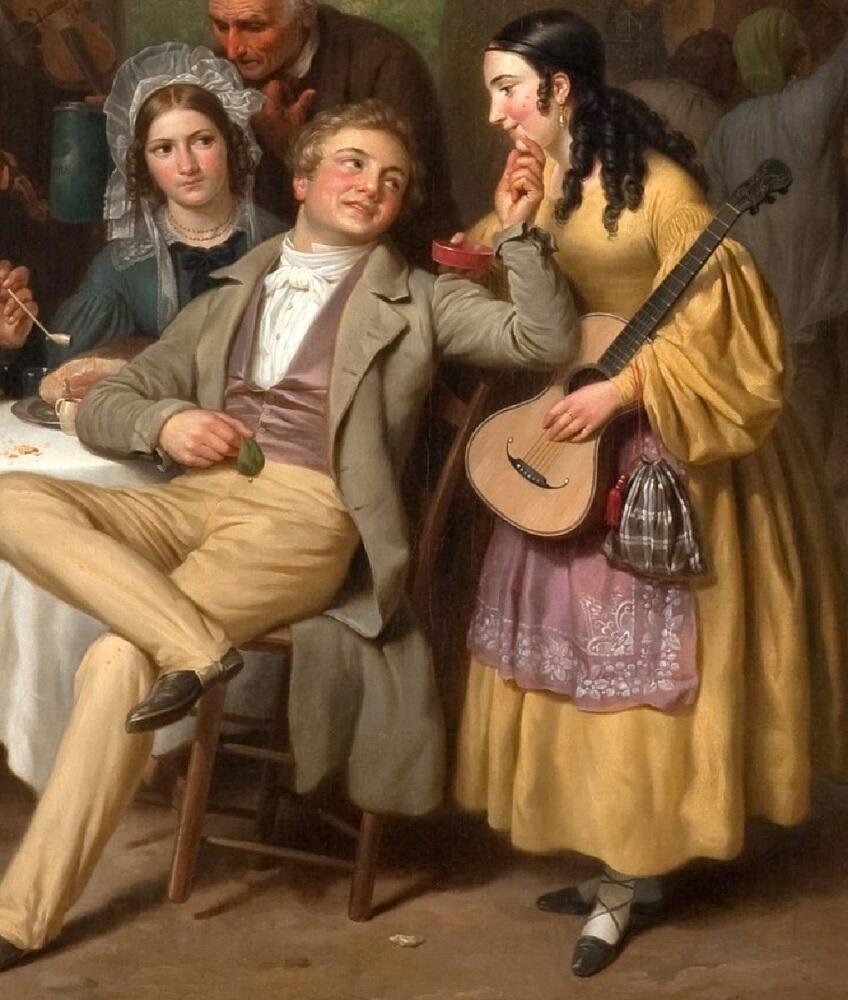 У пары справа — свои проблемы: к столу подошла весьма симпатичная цыганка, и внимание молодого человека переключилось на нее без остатка. Его дама очень насторожена: что будет дальше? А кавалер уже пустил в ход руки: держит цыганку за подбородок. И ей это нравится, тем более что в правой руке юноша держит кошелек!