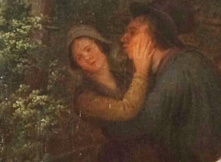 Справа, у обреза картины — деревенский флирт: он пытается добиться благосклонности и буквально прикладывает к этому заметные усилия, но она как бы не очень принимает его домогательства.