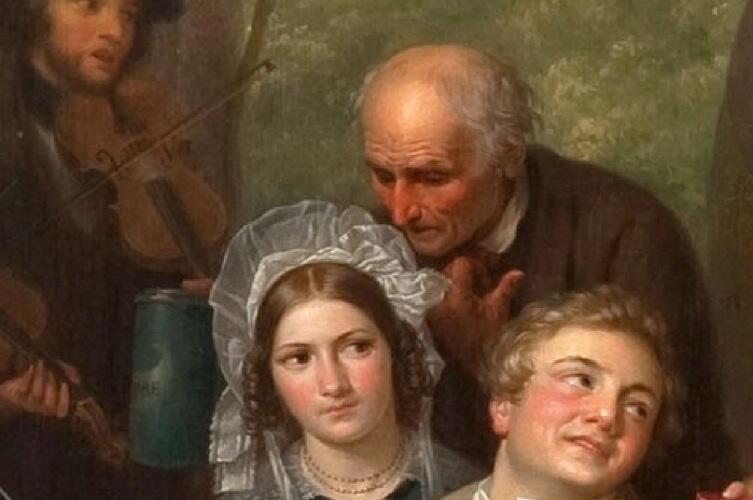 Идиллическую картину портит благообразный седой старик-нищий: он стоит за спиной горожан, в правой руке — большая голубая кружка для милостыни.