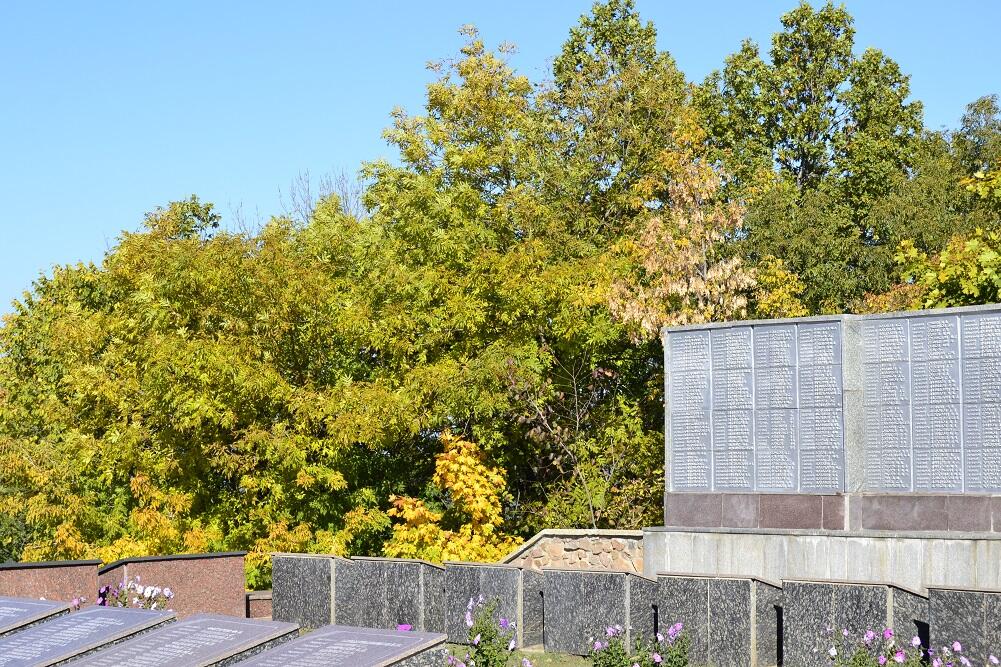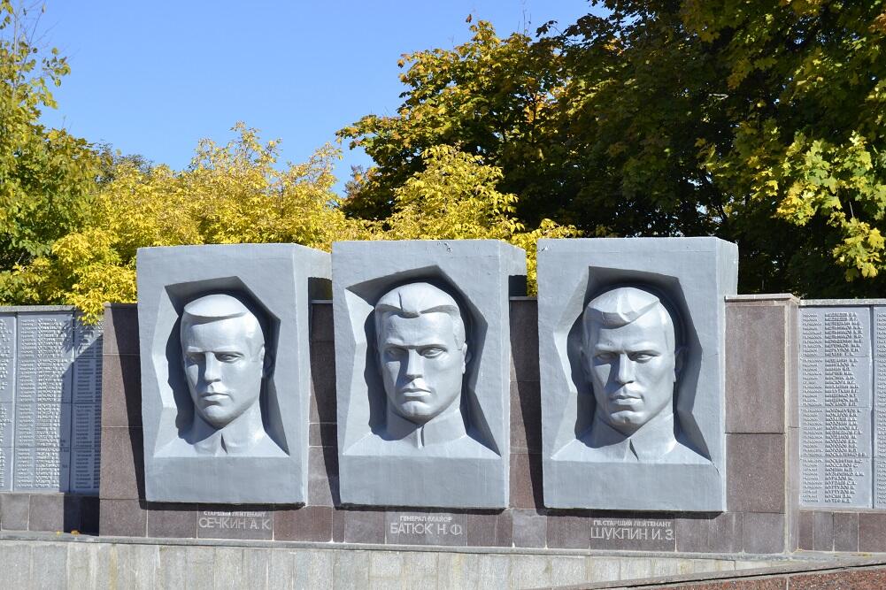 Мемориальные доски и имена, имена, имена — более тысячи имен… Во время войны на этих высотах шли жесточайшие бои. Территория переходила из рук в руки. Командовал стрелковой дивизией Николай Филиппович Батюк. Дивизия прошла длинный путь, они воевали на Брянском фронте, затем Сталинград, бои в районе Мамаева кургана, а в июле 43 г. — бои за Славяногорск.