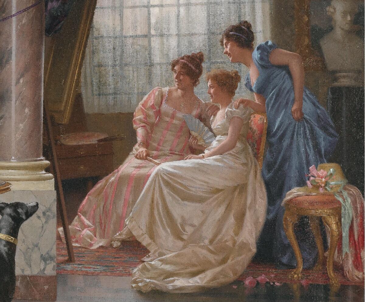 Три разглядывают очередной шедевр. Что изобразил художник — неизвестно, можно предположить, что это портрет той, которую он посадил возле себя. Тогда становится понятным веселье подружек: они обсуждают и платье, и лоб, и нос, и вообще все с изрядной долей издевки («Нет, ты только посмотри, что за уши!»).