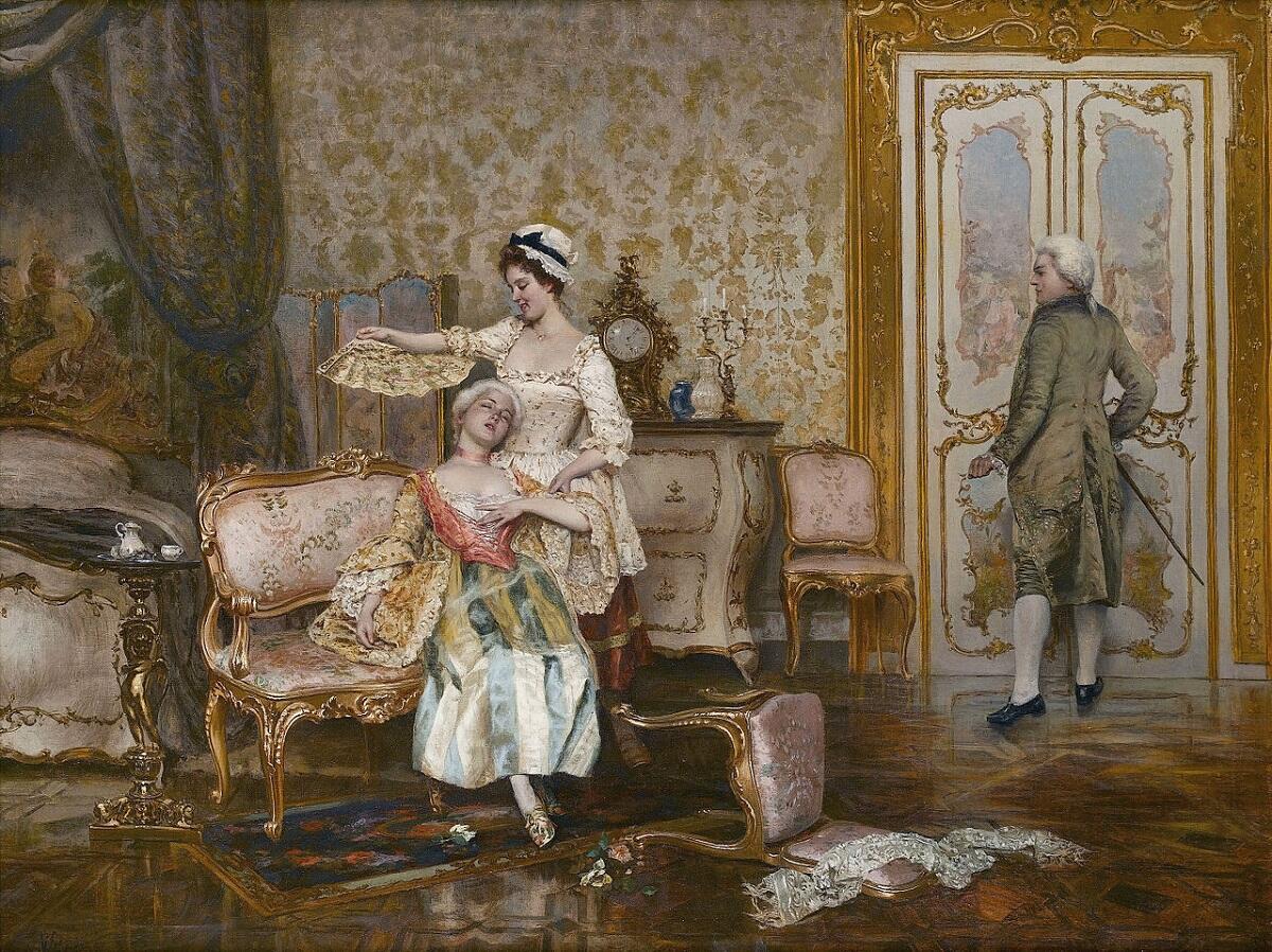 Разговор был необычайно бурным. Может быть, она закатила ему оплеуху, да так, что он свалился со стула. Служанка, подоспевшая на крик, обмахивает хозяйку веером. Казалось бы, госпожа нуждается в сочувствии, но на лице этой милой девицы читается явное злорадство. Почему? То ли хозяйка слишком своенравна, то ли служанке симпатичен кавалер…