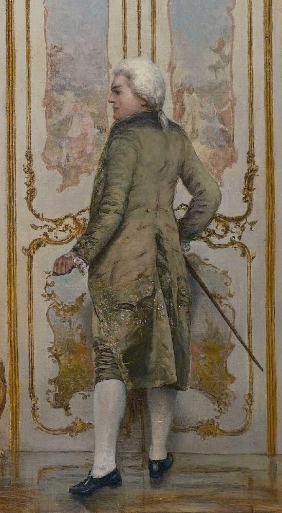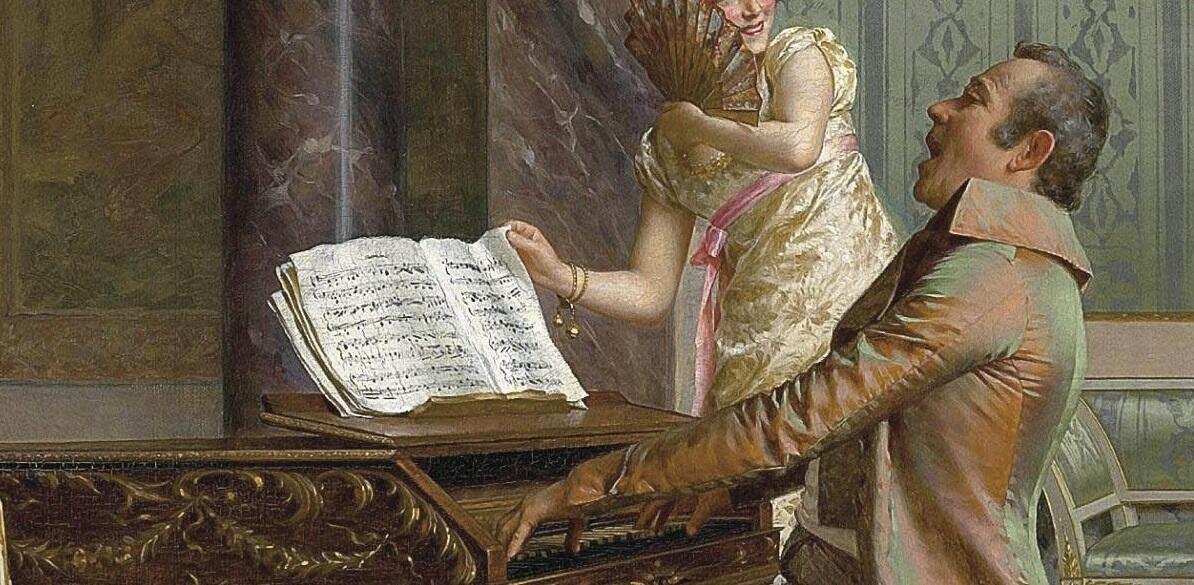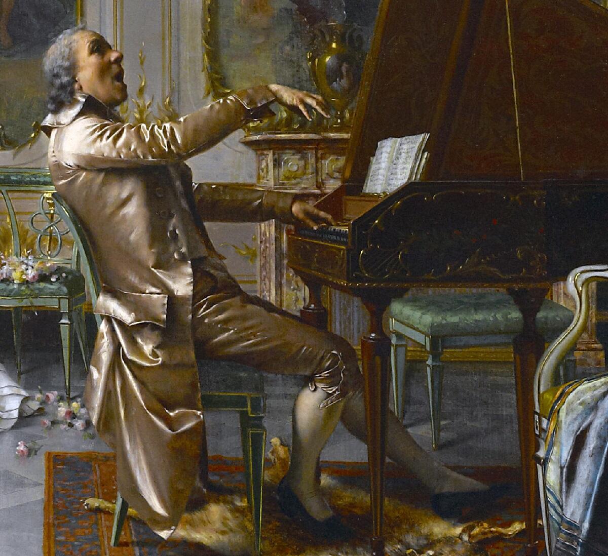 Роскошный салон, мрамор и золото, затейливый пол. У клавесина — погруженный в собственное исполнение музыкант. Видимо, пьеса виртуозная, потому что у него есть помощница, она переворачивает листы нотной тетради.