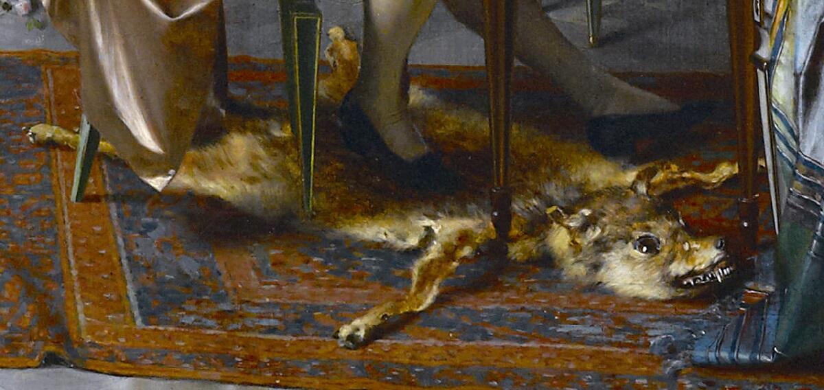 На первый взгляд, ну, весело им, они молоды, им покажи палец — они засмеются. Но есть в картине один элемент, который явно противоречит общему настрою: шкура зверя под ногами музыканта. Яростный оскал разрушает всю идиллию.