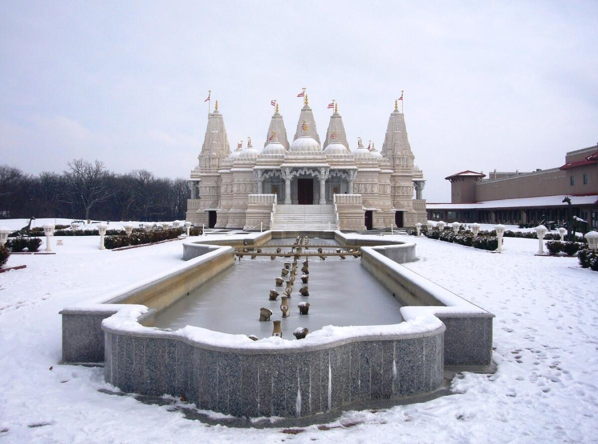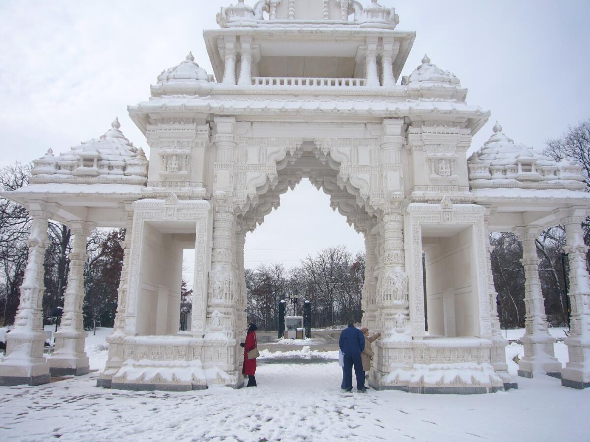 Когда въехали на парковку, я вспомнила, что уже видела подобное религиозное сооружение в Чикаго, в одном из его пригородов — Bartlett, в 2008 году, он и назывался почти так же — Shri Swaminarayan Mandir. Но было это зимой, все утопало в снегу, к тому же погода была пасмурная и снимки вышли неважные. Ниже — снимки храма в пригороде Чикаго и ворота, ведущие к храму.