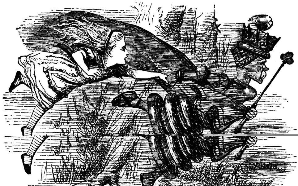 — Какая медлительная страна! — сказала Королева. — Ну, а здесь, знаешь ли, приходится бежать со всех ног, чтобы только остаться на том же месте! Если же хочешь попасть в другое место, тогда нужно бежать по меньшей мере вдвое быстрее!»