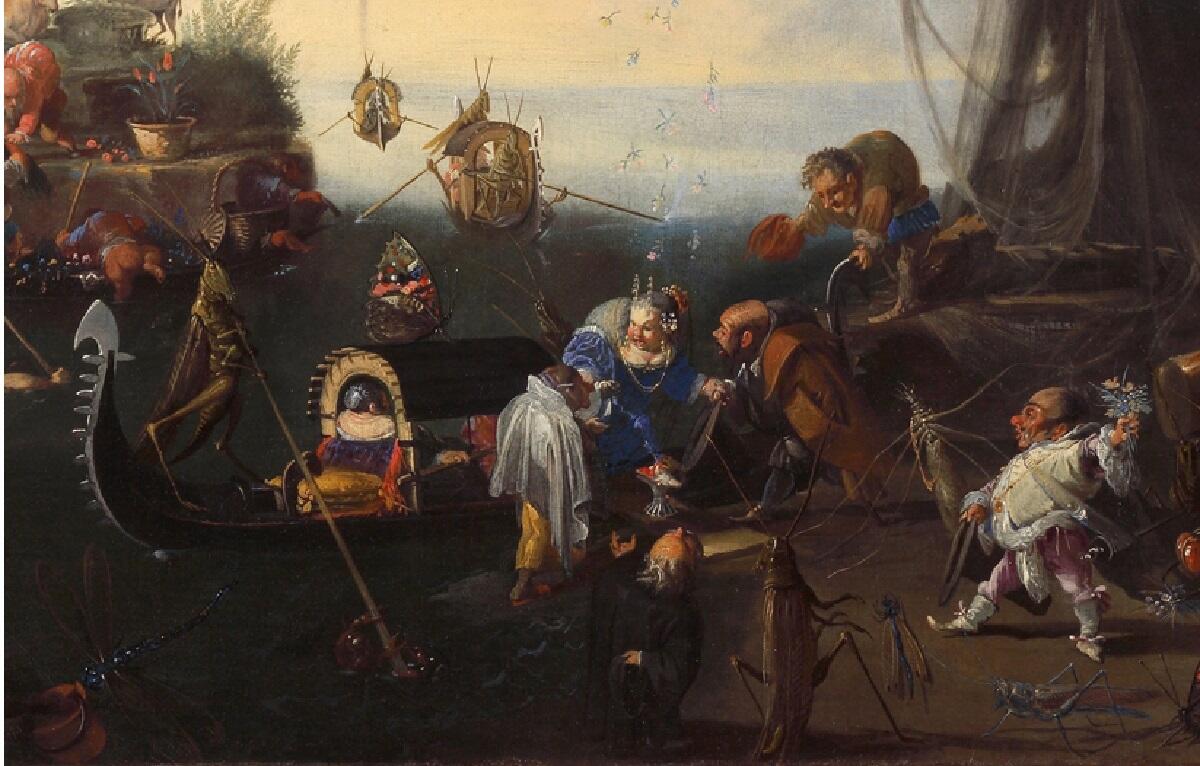 Невеста в синем платье с подобием короны сходит с гондолы, управляемой каким-то членистоногим. Вельможи подают ей руки, помогая спуститься на берег. А перед ней возникает жених — красноносый (возможно, от пристрастия к спиртному), но с букетом.