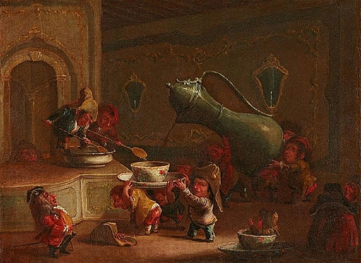 Кстати, в этой сценке показана иерархия: чином пониже держат блюдце, на котором стоит чашка, специалисты добавляют в напиток что-то сладкое, а стоящий слева гном в форме наблюдает за процессом и руководит им.