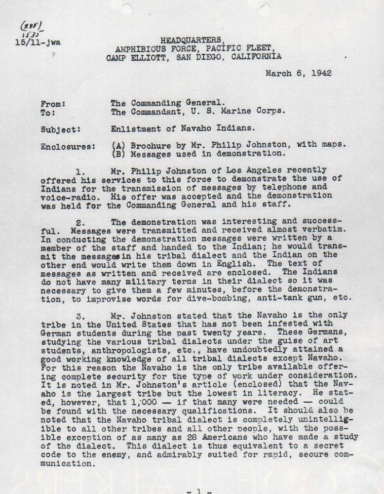 Предложение Джонстона не было новаторским для военного дела. Во время Первой мировой войны в нескольких американских частях, находившихся в Европе, для передачи команд по радио успешно использовали язык индейцев чокто. Филипу Джонстону, вероятно, этот факт был известен.