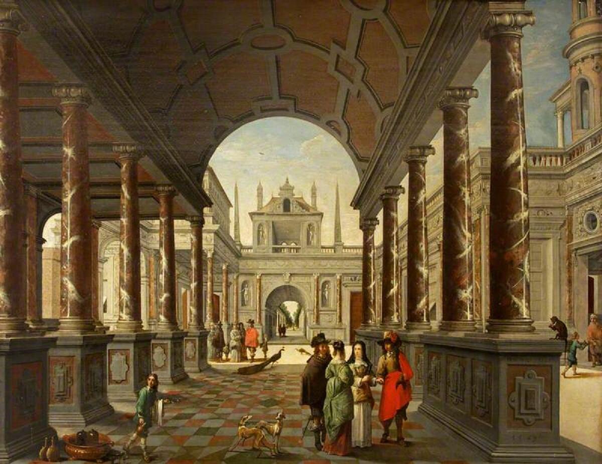Очевиден замысел живописца — показать, как бы мог выглядеть роскошный дворец: колонны цветного мрамора, мозаичные полы, вдали — бесконечная колоннада, шпили над зданием… А человеческие фигуры — только чтобы оживить картинку.