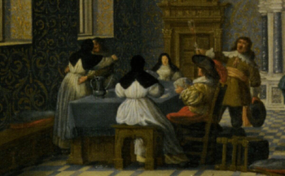 Что понудило Дирка написать такую картинку? Да еще с ярко выраженным антиклерикальным подтекстом? Надо полагать, это художественное воплощение услышанной истории. И самое пикантное здесь — военные развлекаются не с проститутками, что было обычным явлением, а с монашками!