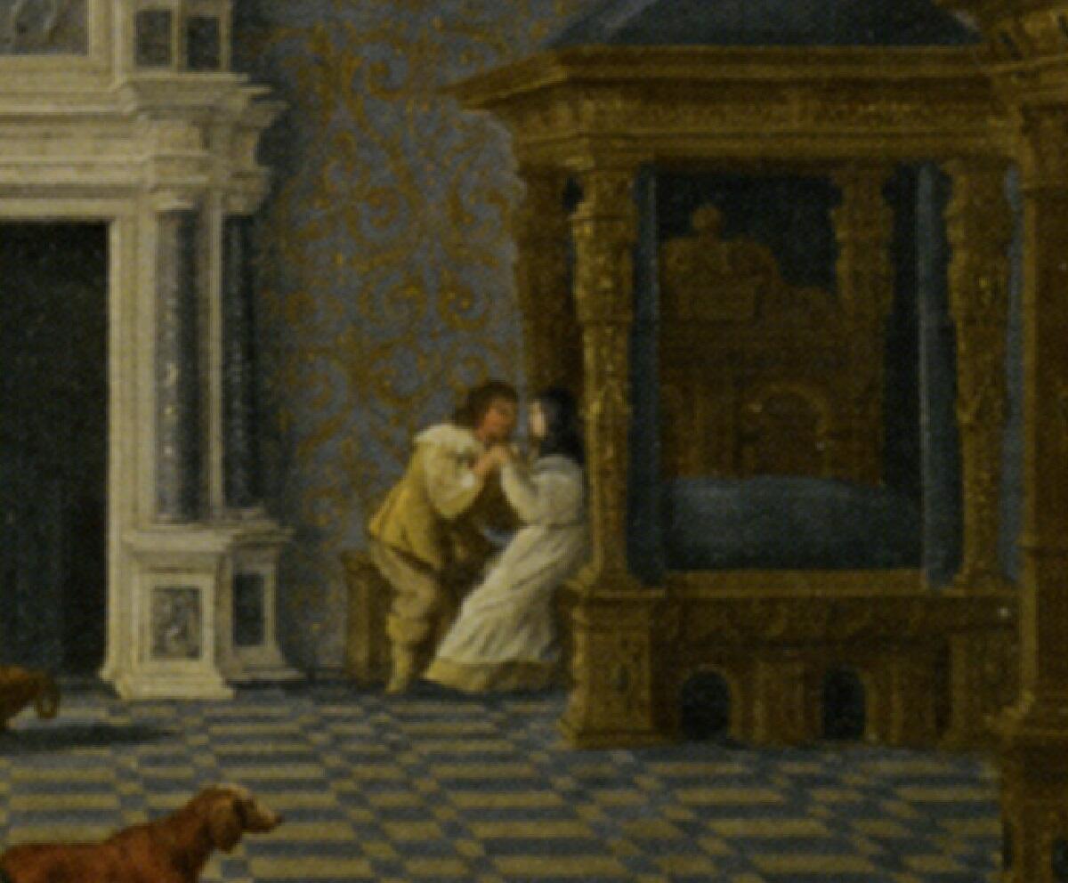 Эта картина почти выпадает из ряда архитектурных полотен художника, хотя фон, на котором показаны персонажи, — и архитектурный, и роскошный (именно поэтому «почти выпадает»). Это скорее жанровая сценка типа казарменной живописи, только что автор поместил своих героев в необычное место.