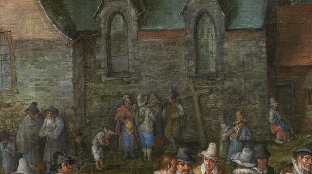 Процессия движется вокруг церкви. А около стен храма идут приготовления к похоронам: к стене прислонен крест, перед ним группа людей обсуждает подробности погребения (человек в зеленоватом одеянии, который стоит рядом с крестом — могильщик?). И здесь же, в сторонке сидят нищие, просят подаяние.