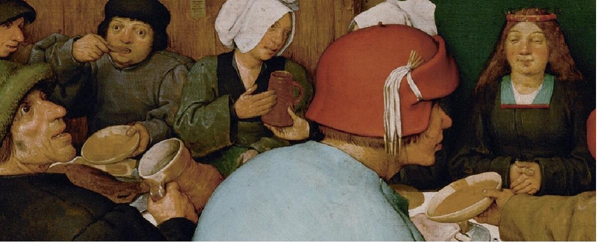 Перед невестой стоит тарелка со свиными ребрышками (невеста не то от волнения, не то по принятому обычаю не притронулась к этому яству), а у остальных участников банкета в тарелках какое-то подобие каши или повидла. Раздача этого блюда продолжается: два разносчика используют для этого снятую с петель амбарную дверь.