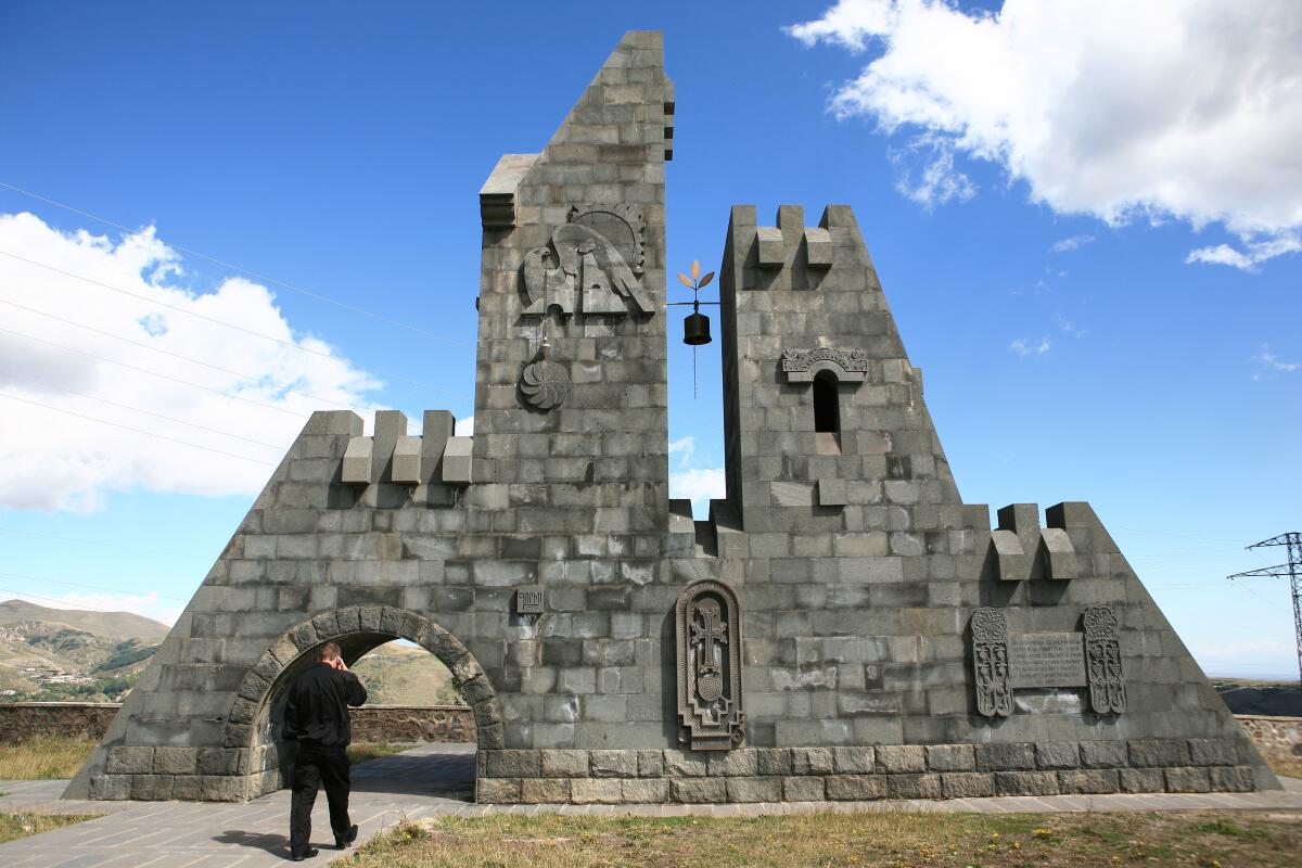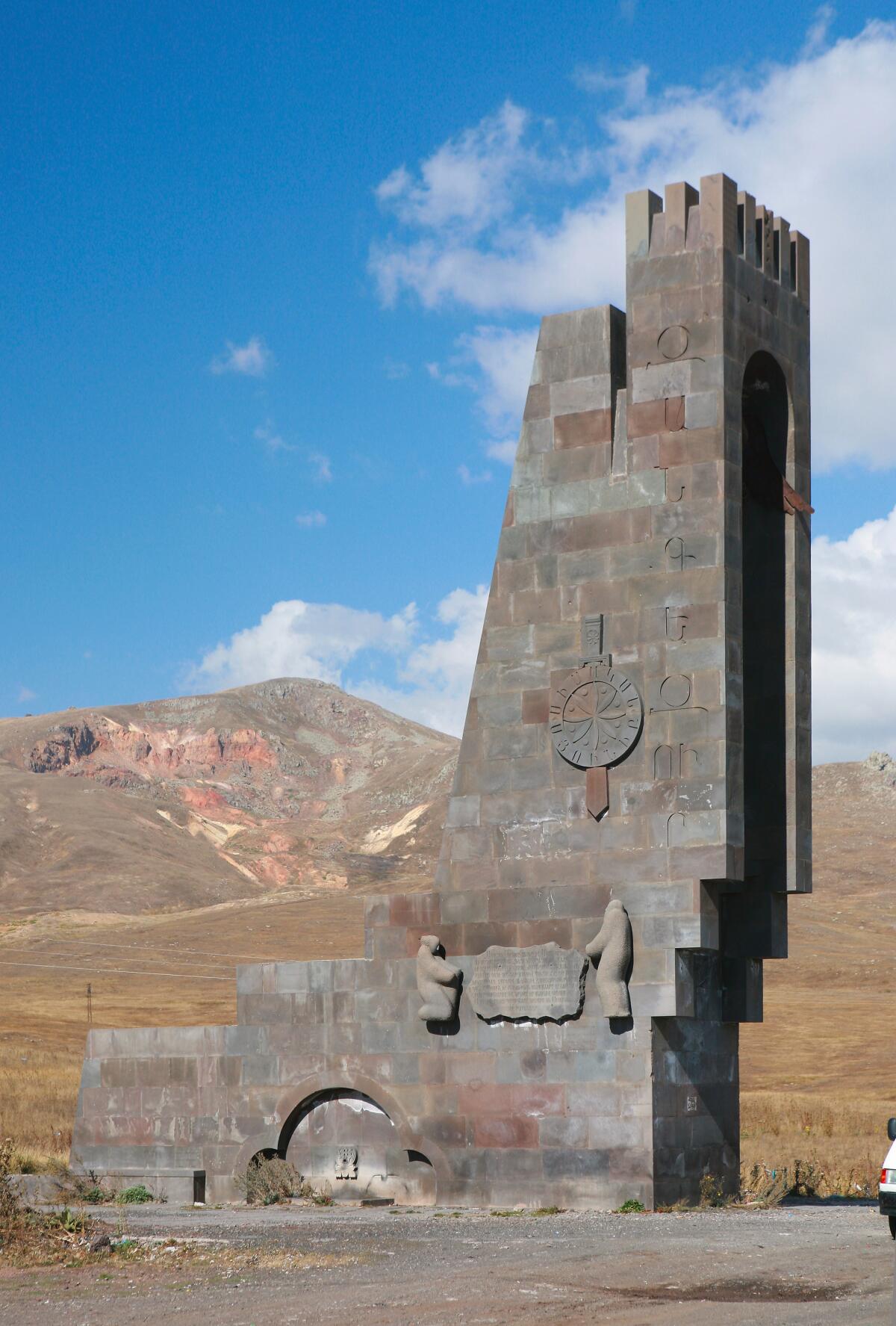 Дорога здесь проходит между двумя стелами в виде каменных башен, образующих как бы ворота в Сюник.