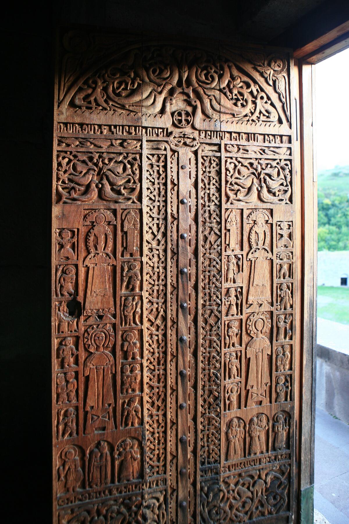 Ну и, наконец, сурб Аствацацин. Это небольшая надвратная церковь, сохранившаяся с незапамятных времён. Неоднократно разрушенная землетрясением, она неизменно восстанавливалась. Больше про неё никто ничего не знает. Она архитектурно обогащает монастырский ансамбль, и этого довольно. К тому же у неё замечательная резная деревянная дверь.