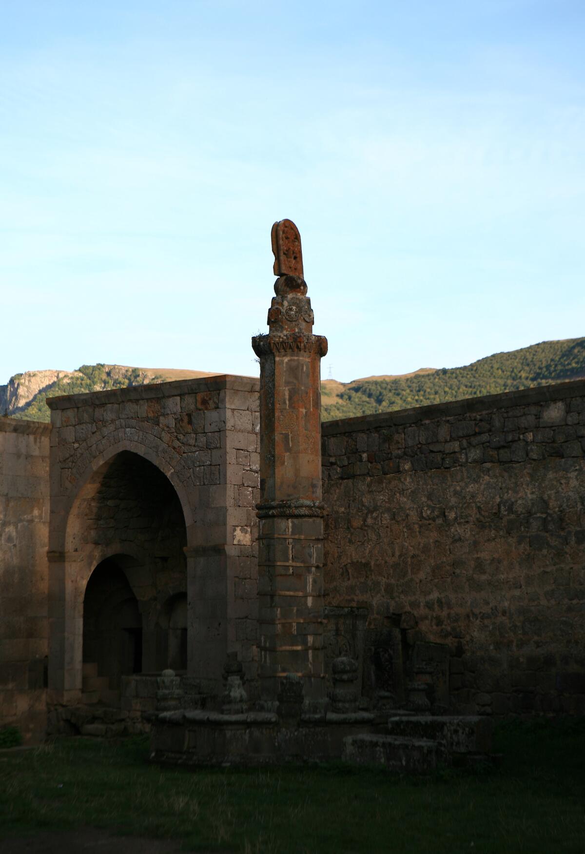 Ах, да, есть ещё знаменитый качающийся столб «Гавазан», что в переводе означает посох. Построенный в 904 году во дворе Татевского монастыря, он за счёт установки на шарнир мог отклоняться от оси. Особого смысла в этом не было, но решение интересное, жаль что ныне он закреплен намертво.