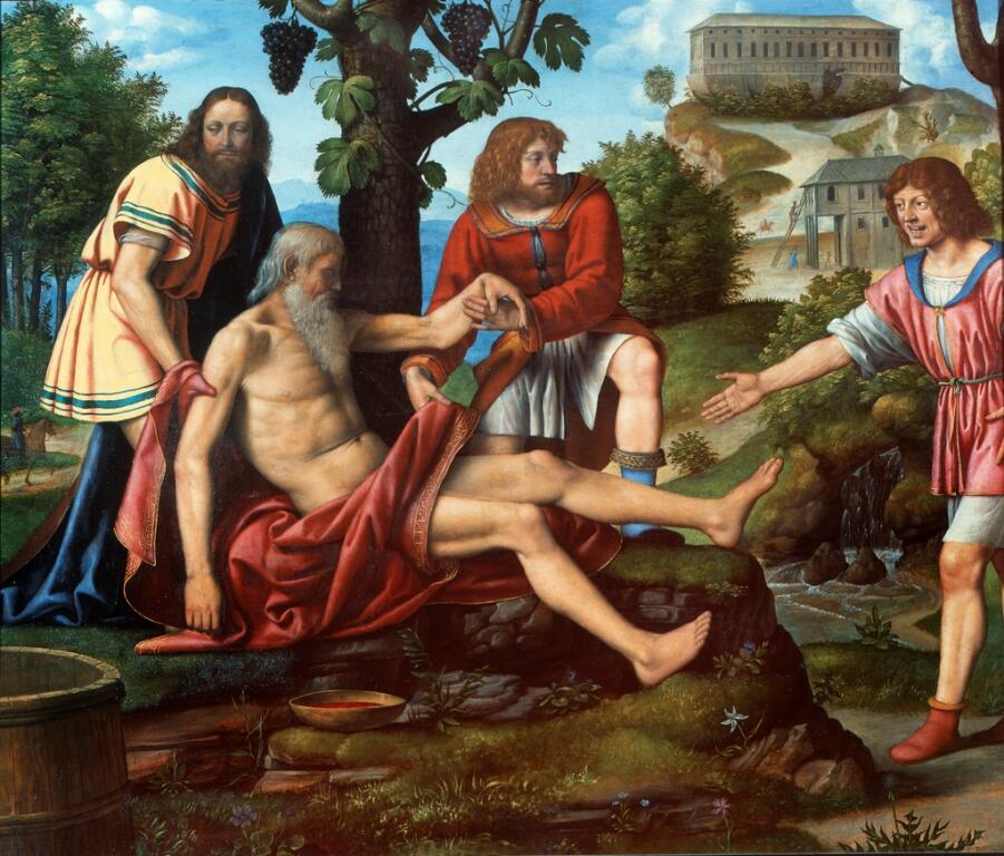 То, что братья Беллини неплохо знали изображаемый материал, несомненно. Они тщательно выписали наряды восточных купцов. Турки — в тюрбанах поменьше, египтяне — в тюрбанах крупных и пышных. В центре картины, непосредственно за сидящими женщинами, венецианцы говорят с двумя евреями в полосатых халатах. Они, без сомнения, могли найти общий язык. Еврейское присутствие в Венеции было давним: один из островов архипелага назывался Джудеккой, а название литейного двора, рядом с которым размещался еврейский квартал, Гетто, стало словом нарицательным и, можно сказать, еврейским.