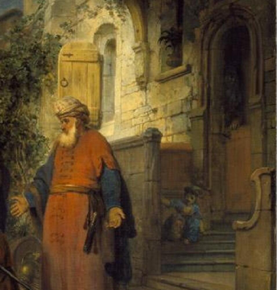 Прощание не было легким и простым: Агарь с мертвенно бледным лицом (в ее левой руке полотенце, которым она вытирает текущие ручьем слезы, в правой — кувшин с водой, единственное, что ей позволили взять), Аврам с разведенными руками как бы говорит, что он не может сопротивляться настояниям жены (наверное, ему не очень легко проститься с той, которая — хоть и ненадолго — вернула ему давно забытые ощущения). Его старший сын Измаил уткнулся в подол матери, а младший сын Исаак на крыльце подсматривает за тем, что происходит.