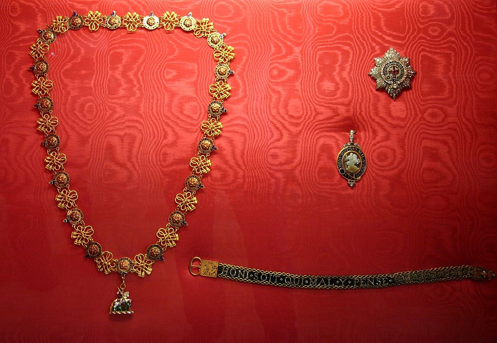 Легенда утверждает, что он фактически был «учрежден» на балу, когда придворная дама-фаворитка во время танца с королем Эдуардом III уронила подвязку и была «награждена» смехом окружающих. Последний не смутил ее партнера. Благородный венценосный рыцарь не только поднял с пола утраченную деталь гардероба своей возлюбленной, но и повязал тесьму себе на плечо со словами: «Honi soit qui mal y pense», которые стали девизом созданного им ордена. Теперь серебряные, украшенные бриллиантами буквы можно видеть на ленте любого кавалера, удостоенного королевской награды.