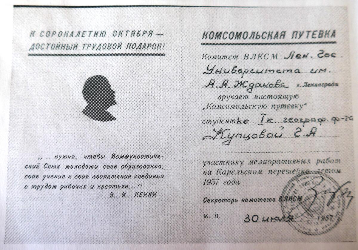 Когда я поступила в Ленинградский университет, вновь поступившим предложили поехать на мелиоративные работы на Карельском перешейке, у меня сохранился распечаток той Комсомольской путевки 1957 года.