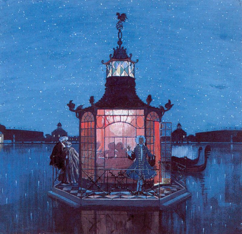 Совершенно оригинальная картина «Китайский павильон. Ревнивец», написанная мастером в 1906 году, которую можно увидеть в Государственной Третьяковской галерее (Москва), говорит нам о хрупкости и мимолетности этого мира. Произведение написано в стиле рококо (который блеснул на небосклоне европейской культуры, подобно яркой вспышке, и давно угас) и напоминает китайский театр теней.
