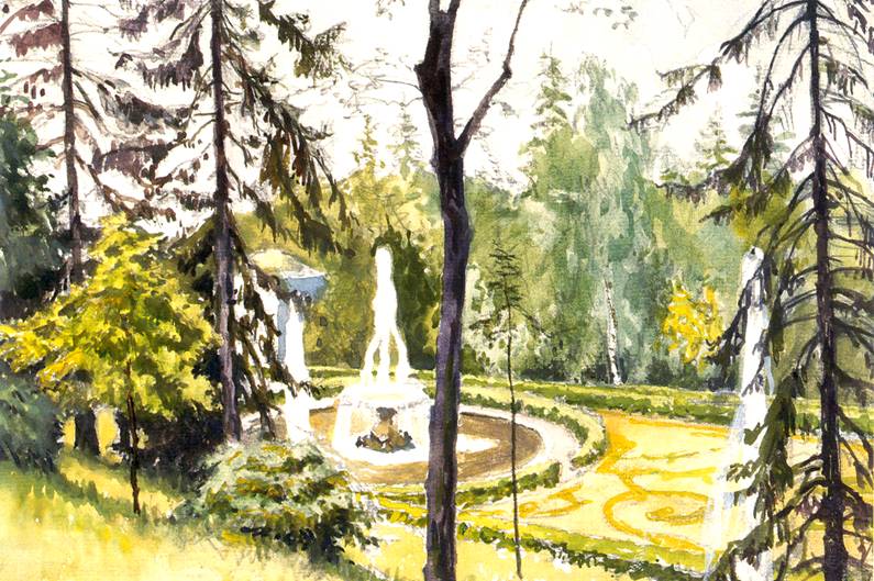 Но особенно выразительна картина, где художник достиг вершин мастерства, это «Петергоф. Главный фонтан», написанная им в 1942 г. От нее веет чувством невыразимого счастья, непрекращающегося лета и веселого праздника жизни. Вся картина написана в зеленой, желтой и светло-голубой гамме. Завораживающие струи фонтана, бьющие в разные стороны в лучах невидимого солнца. Как пленителен чудный летний день, изображенный на картине!