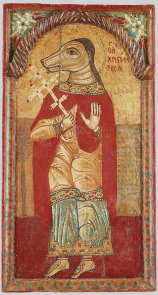 Но ещё утверждалось, что святой Христофор испросил необычную внешность, дабы сделать свои проповеди более убедительными среди язычников. Кстати, исследователи усматривают в зооморфном образе своеобразный сплав традиций. В частности, проводилась параллель с египетским богом Анубисом, который изображался с головой собаки либо шакала. Согласно мифологии, он был проводником в загробный мир.