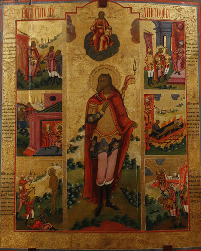 Святой мученик Христофор почитается и православной, и католической церквями. Он жил в III веке и пострадал при императоре Деции Траяне — яром гонителе христиан. Вокруг жизни святого Христофора сложилось много преданий, мифов и легенд. А икону его невозможно спутать с другими. Правда, таких изображений дошло до нашего времени немного — после реформы патриарха Никона они были запрещены.