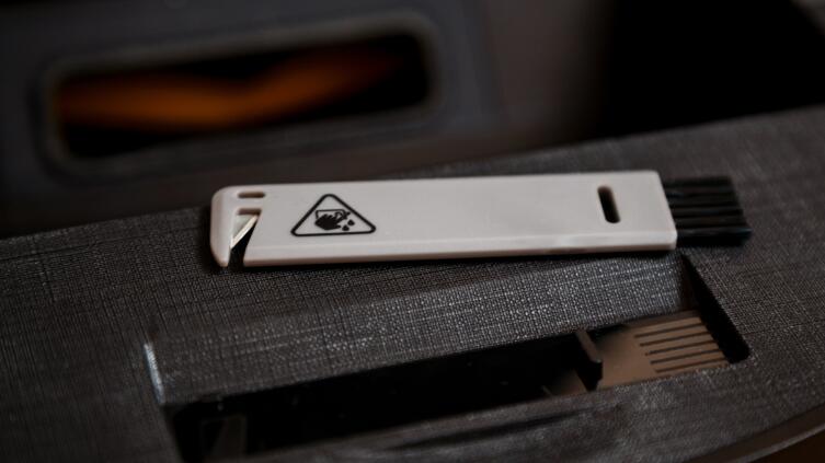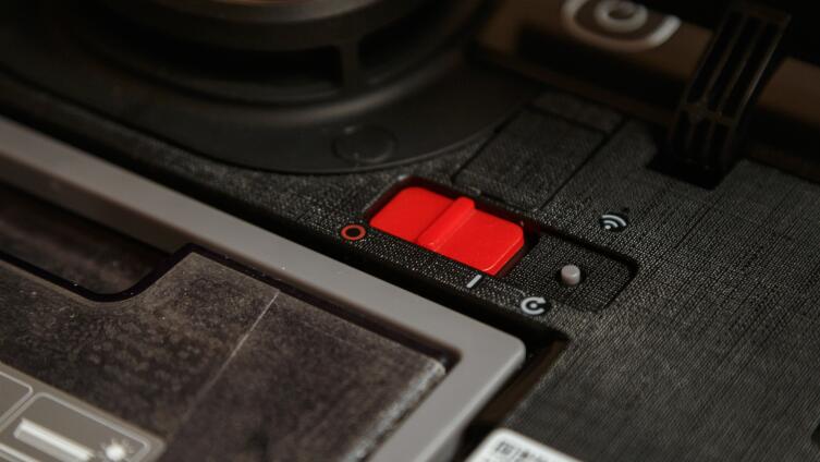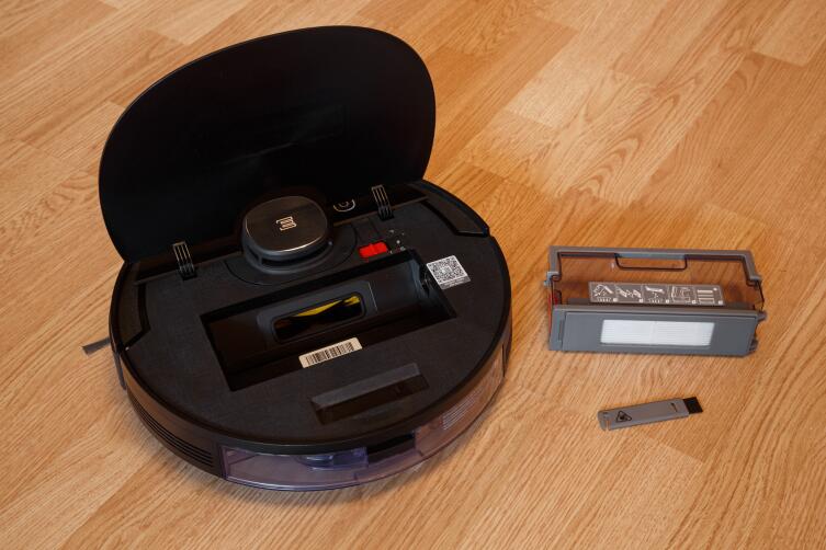 Если поднять верхнюю крышку, там обнаружатся: тумблер включения, пластиковый пылесборник с фильтром и жёсткая кисточка для чистки пылесоса со встроенным лезвием для разрезания застрявших волос. Пространство вокруг них обтянуто плотной тканью, на ощупь напоминающей холст.