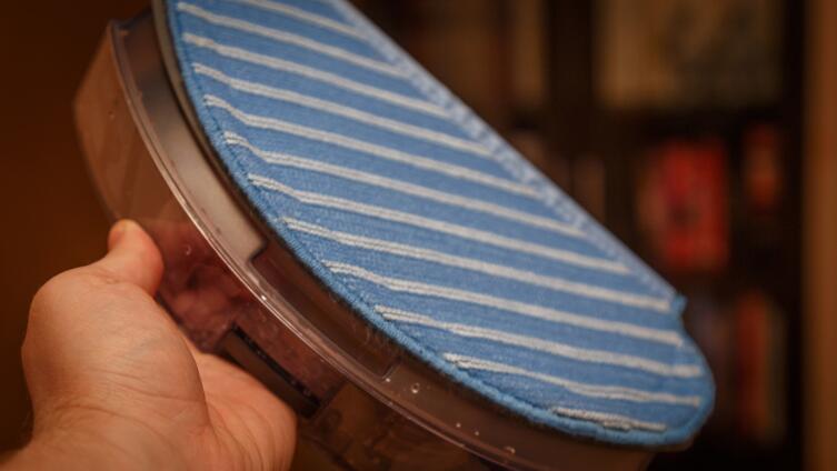 Модуль с мопом, предназначенный для влажной уборки, прикрепляется к резервуару для воды. Сам моп сшит из грубой микрофибры и предназначен для многоразового использования. Жидкость на него подаётся через специальный насос, который обеспечивает его равномерное увлажнение. Это позволяет, с одной стороны, эффективно чистить пол, с другой — избегать на нём луж и водяных разводов. Въевшуюся грязь этот пылесос отмыть, конечно, не в состоянии, но повседневные лёгкие загрязнения смываются им легко и непринуждённо.