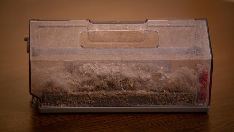 Пылесборник сделан из очень качественного пластика. Вынимается он одним лёгким движением. Открывается — при нажатии на красную кнопку. Просыпать мусор из него мимо урны — нужно очень постараться.
